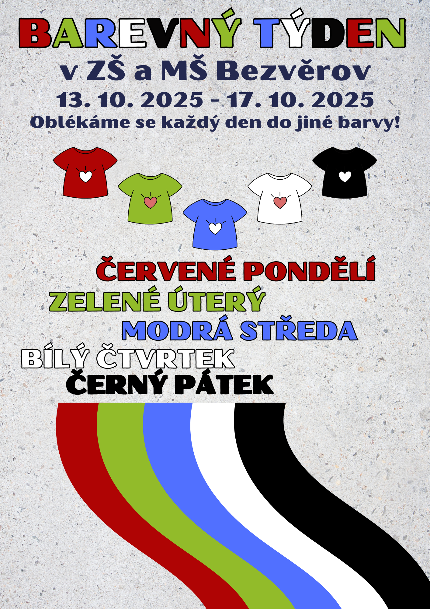 V týdnu 13.10. - 17.10.2025 máme ve škole barevný týden a (nejen) oblékáme se do barev!