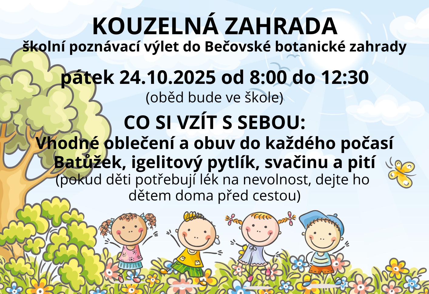 Prosíme rodiče, aby dětem připravili vhodné oblečení a boty. Návrat ke škole v 16:00 hod.